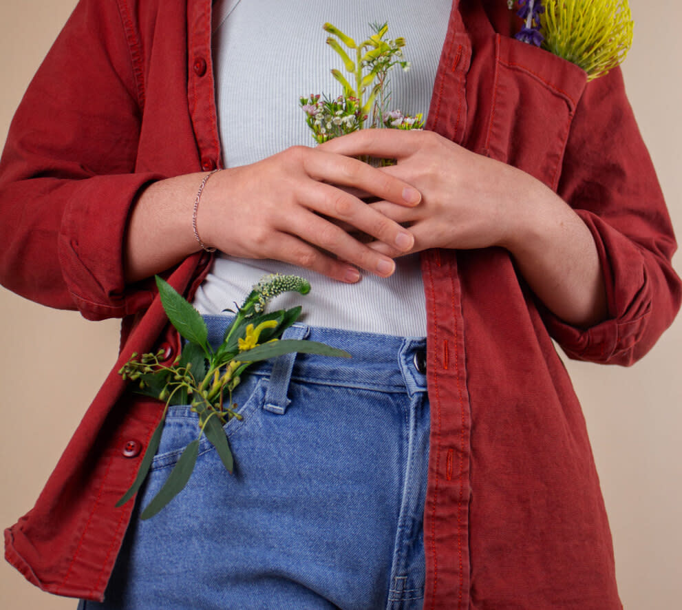 Central part of a woman's body  dressed in blue jeans, red jacket and white shirt with pockets filled with live plants and flowers.Macro shot of eucalyptus leaves.